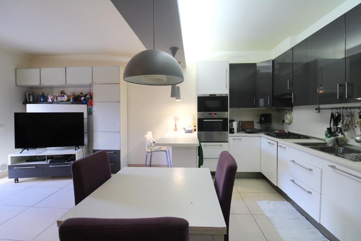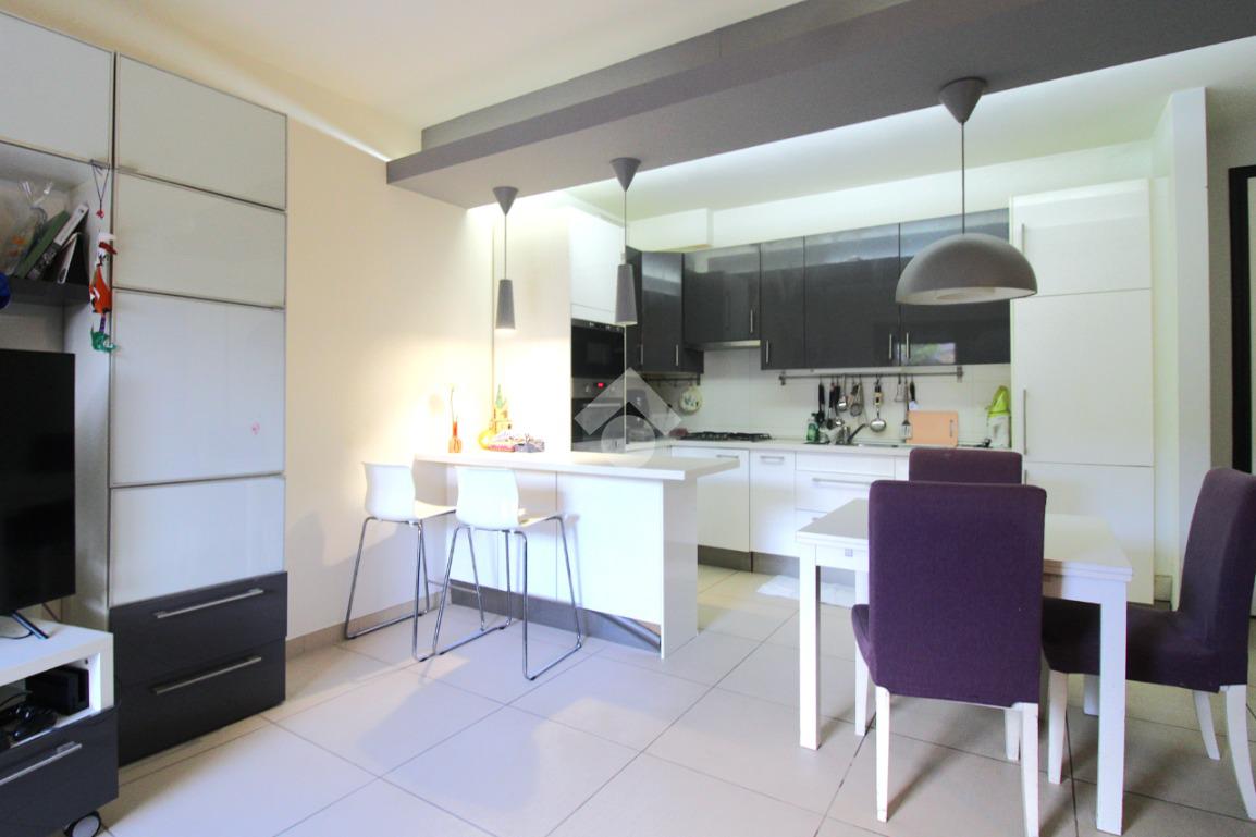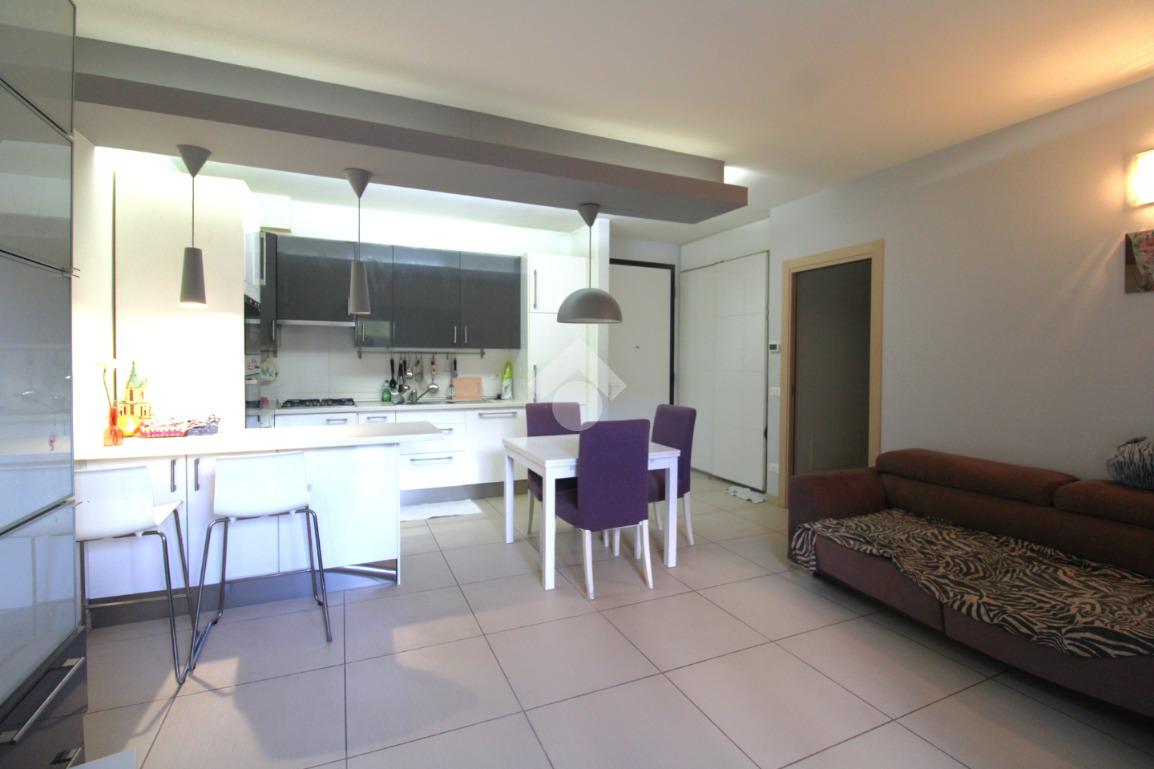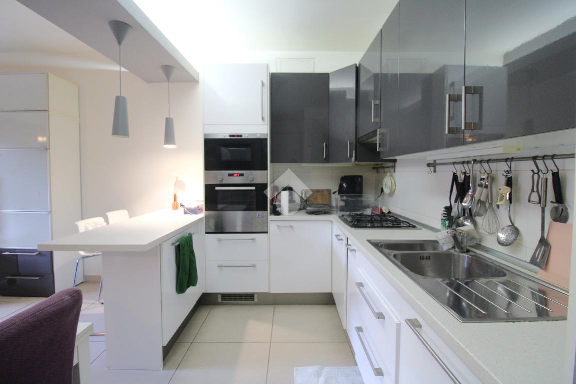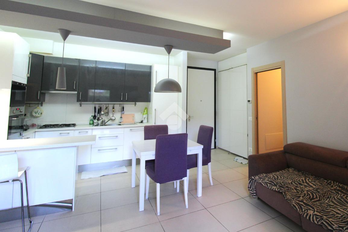 La porta si apre sulla zona giorno, ampia e luminosa, arredata in stile moderno: un ambiente unico, con una cucina in nicchia separata dal soggiorno da una pratica penisola.