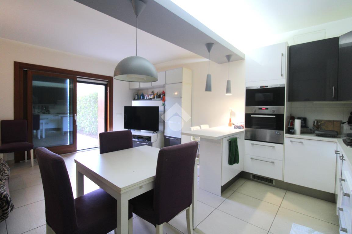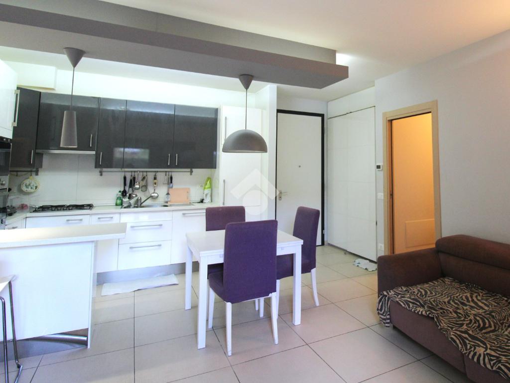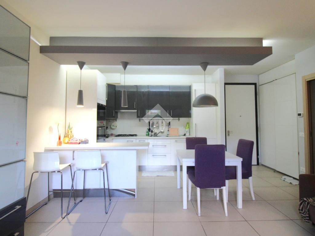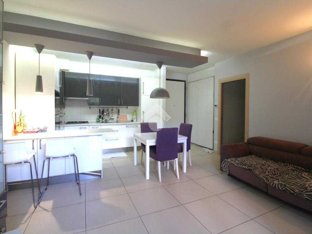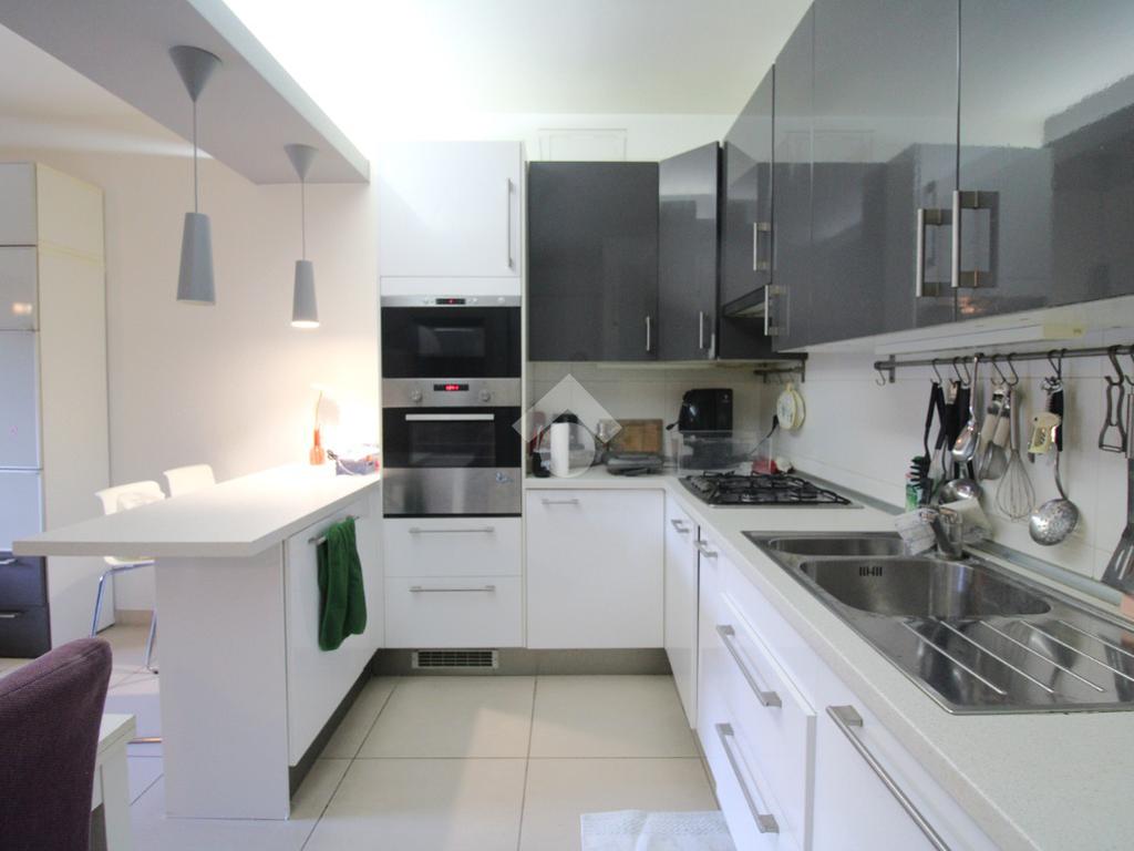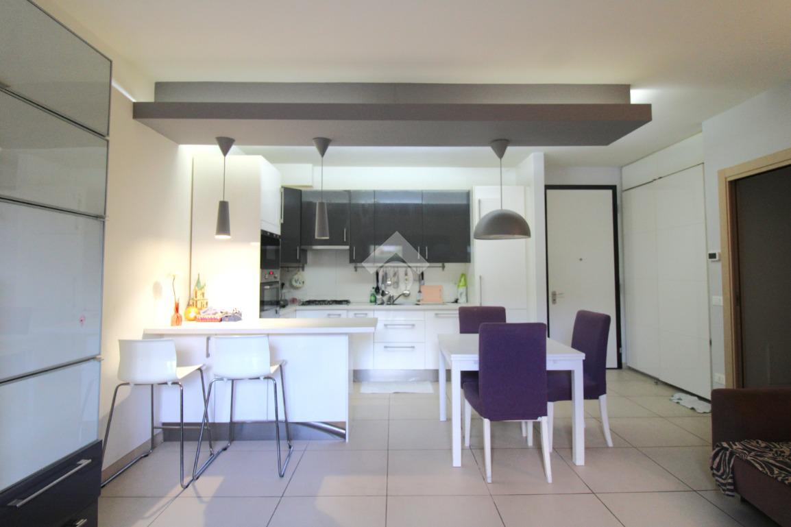La porta si apre sulla zona giorno, ampia e luminosa, arredata in stile moderno: un ambiente unico, con una cucina in nicchia separata dal soggiorno da una pratica penisola.
