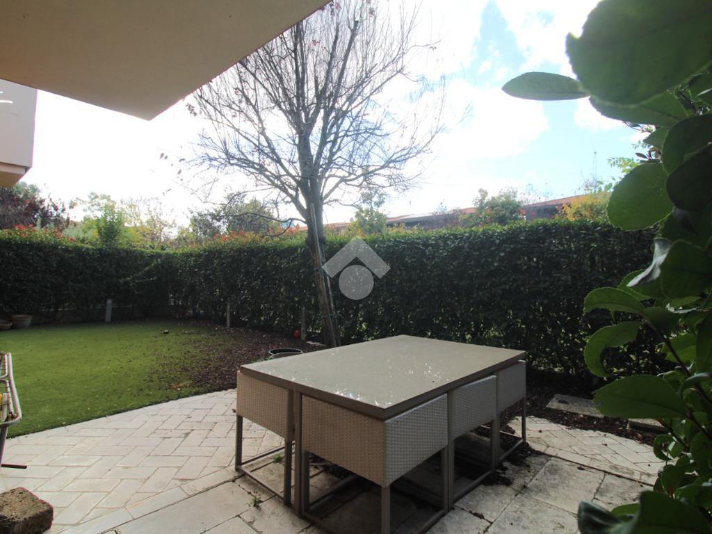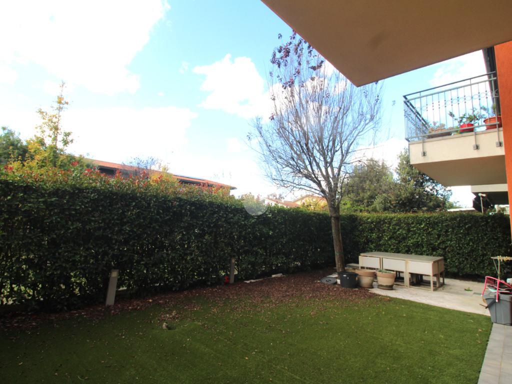 Tutte le stanze dell'appartamento si affacciano sul giardino privato, protetto da una alta siepe per garantire la privacy: esso è coperto da un prato sintetico, facilmente rimovibile nel caso si privilegiasse avere un'area verde.