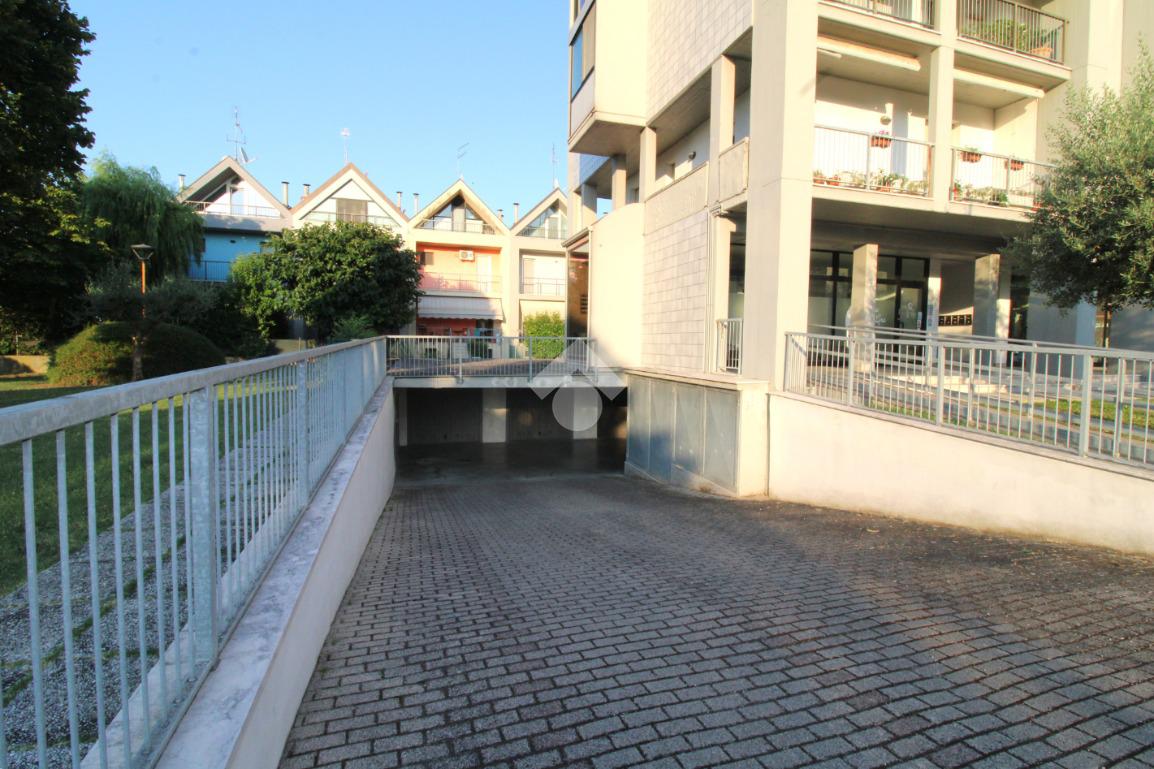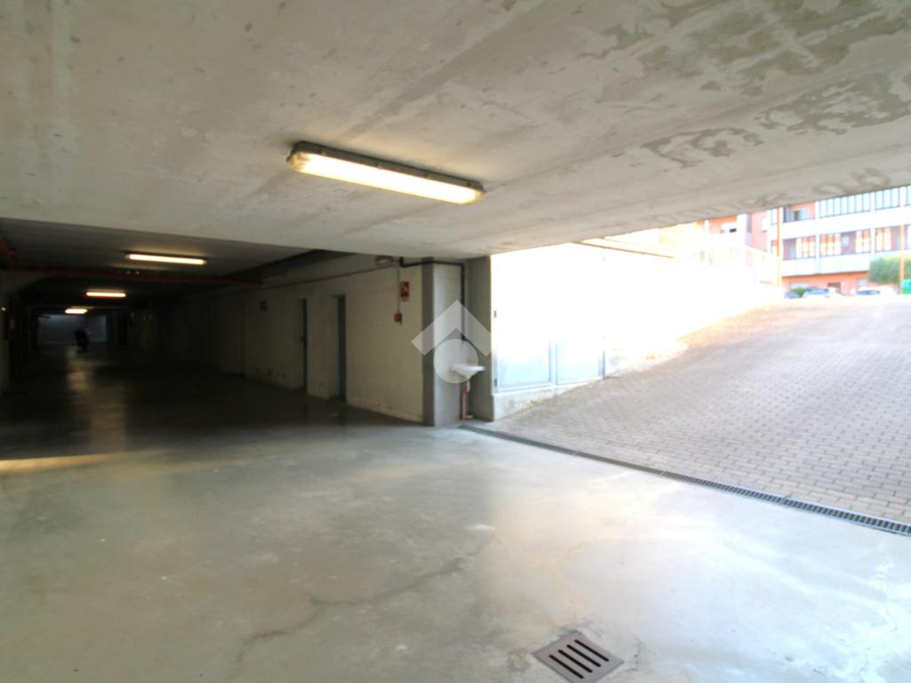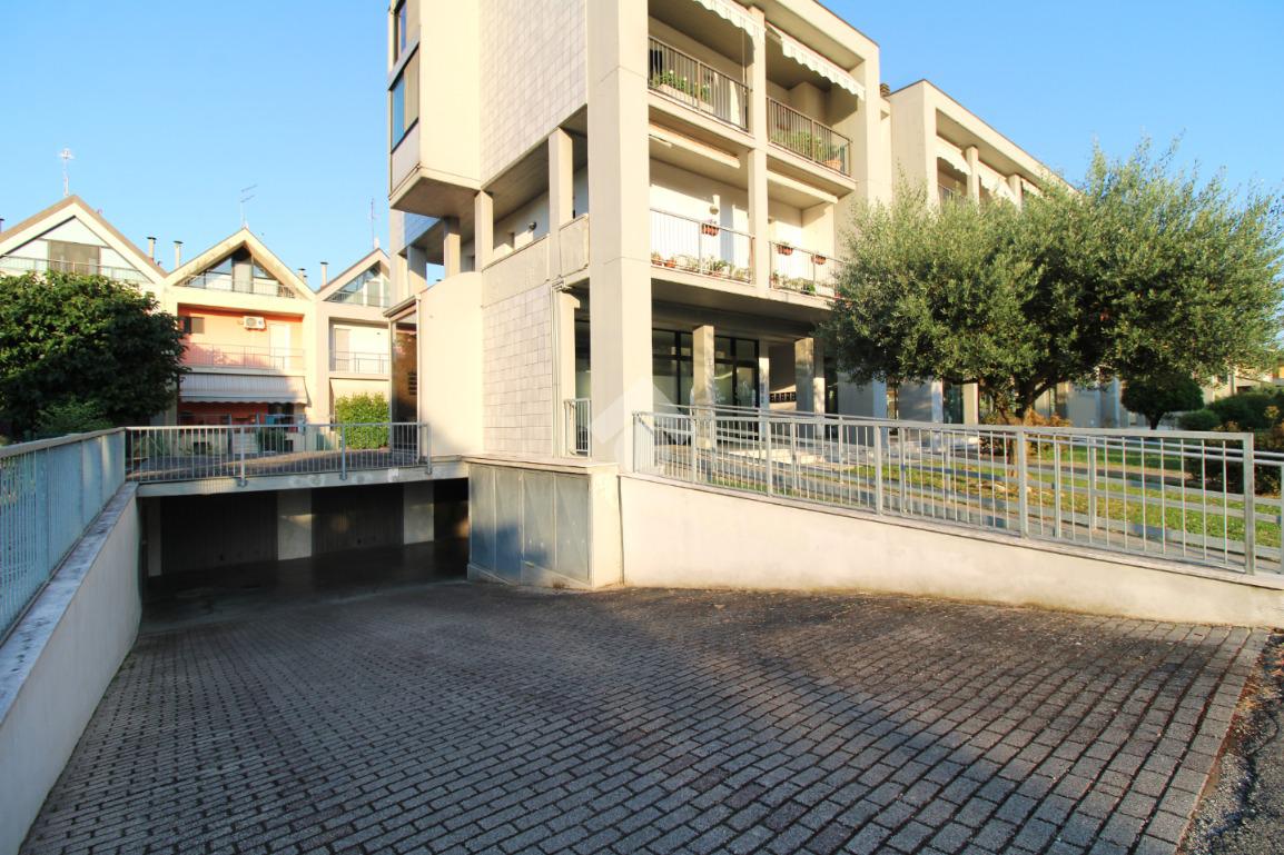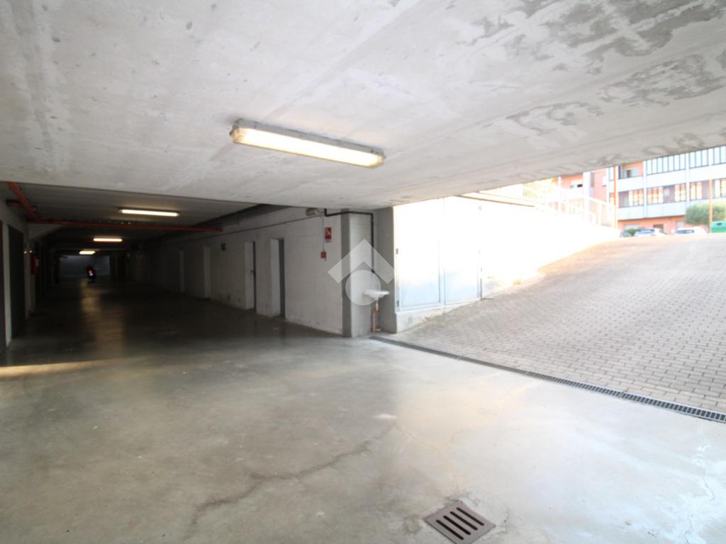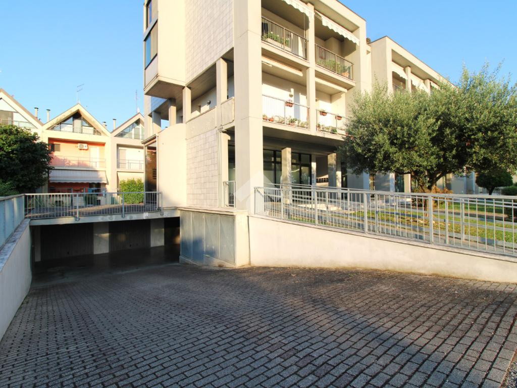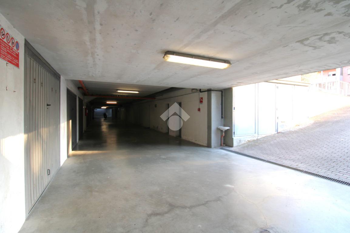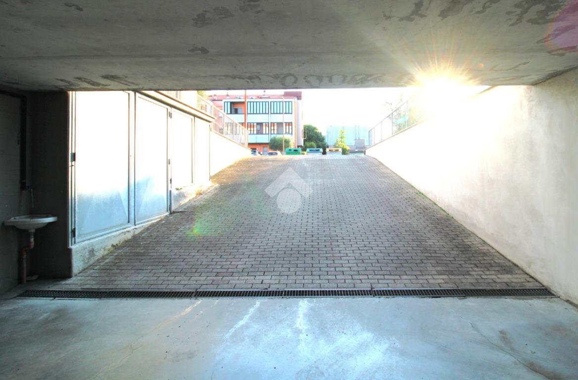 In contesto residenziale degli anni Novanta, in cui sono presenti attività e appartamenti, è in vendita un box auto coperto.